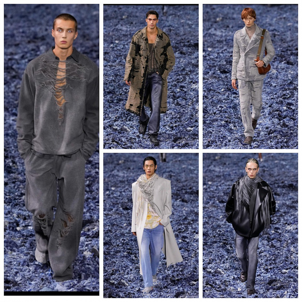 Всем известный DIESEL представил уже знакомый стиль в современной интерпретации. Свободный крой, многослойность серый и синий цвет - современный уличный стиль.